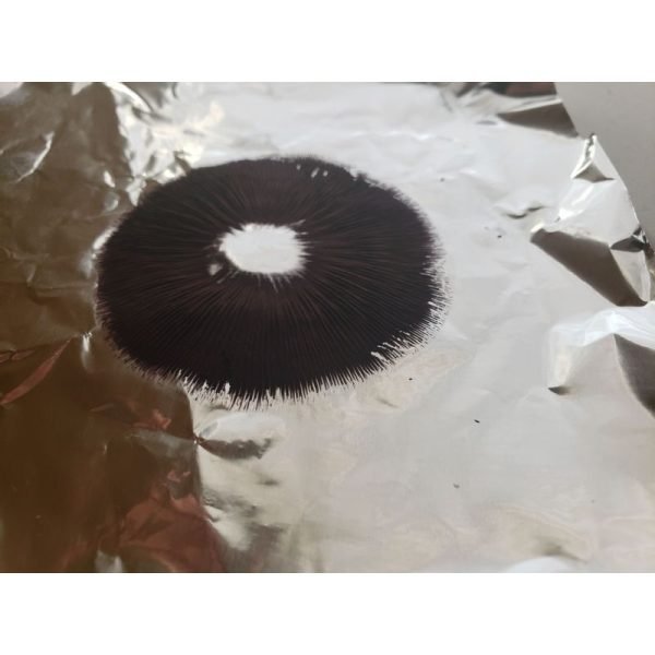 The mushroom Spore prints are made on sterile foil stored in a sterile ziplock bag and kept under refrigerated conditions. Each spore print has a tiny scratch of spores removed from the print. With this swab, a test runs on agar or liquid culture is made to check the conditions of the spores. Only spores that germinate are released as a print.